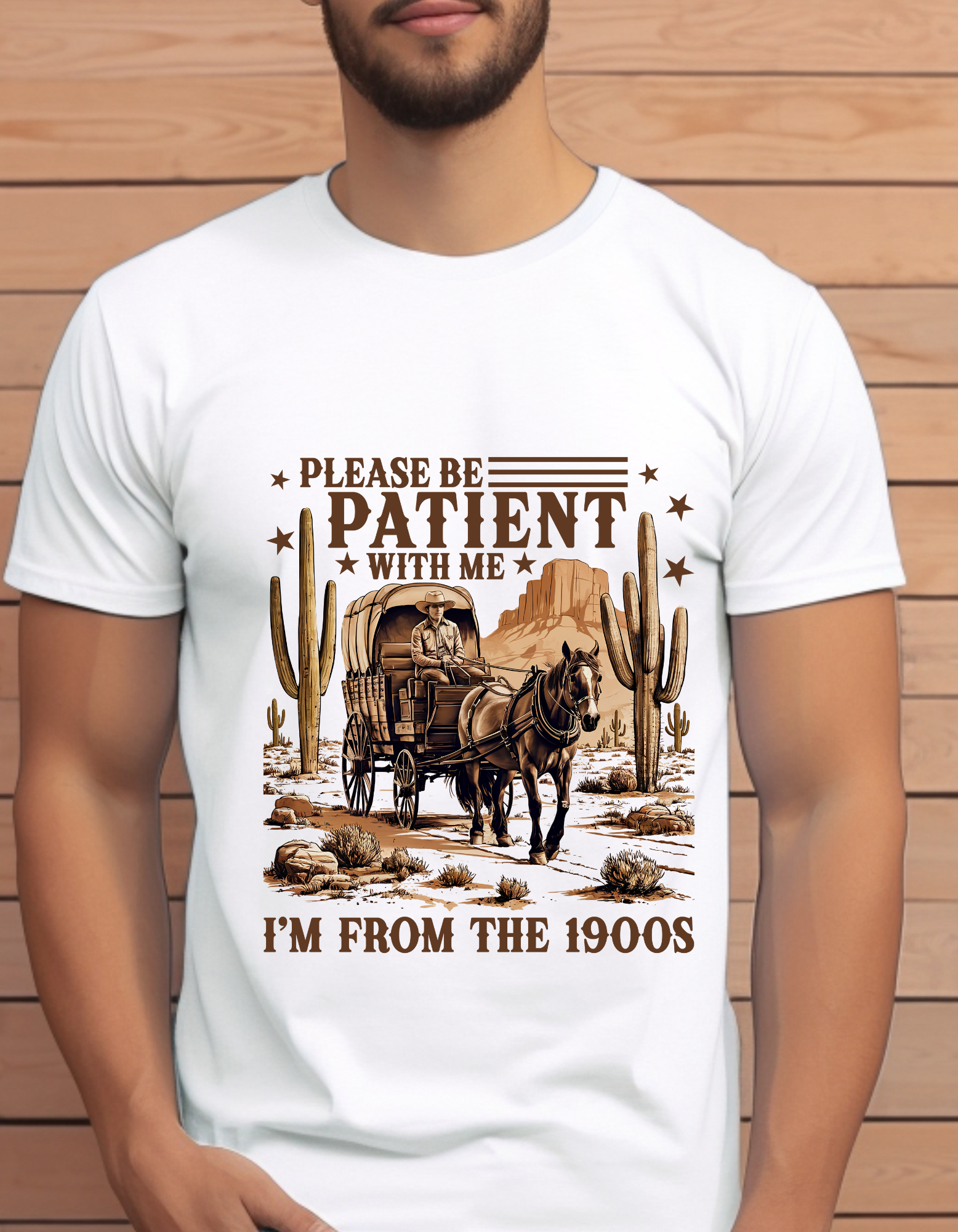 A humorous tee that reads, "Please be patient with me, I'm from the 1900's," playfully poking fun at feeling out-of-date in the tech-savvy 21st century. Perfect for vintage souls!
